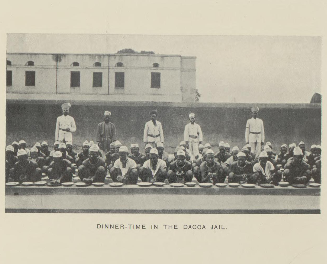 দুটি ছবি ঢাকার নাজিমুদ্দিন রোডের কেন্দ্রীয় কারাগারের ভেতরের ছবি। একটি ছবিতে দেখা যায় বন্দীরা সারিবদ্ধভাবে বসে চরকায় সূতা কাটছে। আরেকটি ছবিতে দেখানো হয়েছে বন্দীরা সুশৃঙ্খলভাবে খেতে বসেছে। খাওয়ার ছবি এবং ক্যাপশনটি পড়ে মনে হয় সেসময় কারাগারে ‘ডিনার’ হতো ব্রিটিশ নিয়মে—অর্থাৎ বিকেল অথবা সন্ধ্যার দিকে।